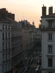 Back home on the Metro, along with half of Lyon it seemed like, then change clothes and enjoy our room for a while before dinner. Here’s a look out our window, up the street toward Place Belcour–a huge huge huge city square in Lyon.