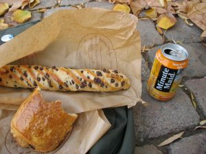 The pain du chocolate went first (the half-eaten roll in the front) and the other, a soft chewy bread studded with chocolate chips lasted me all morning and until my late afternoon lunch, one delicious sweet mouthful at a time.