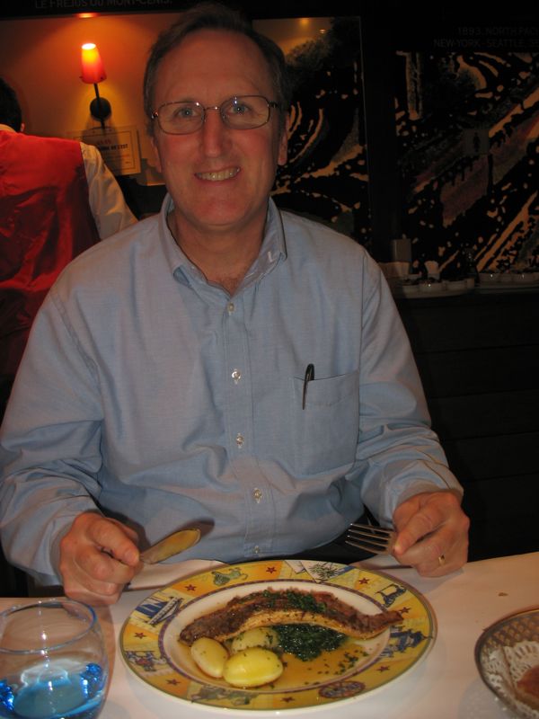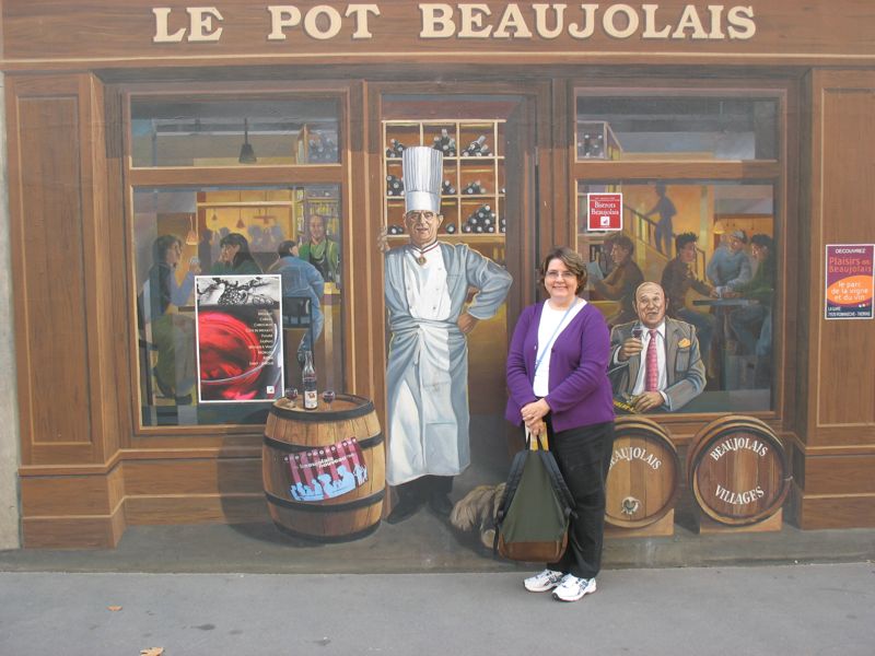 After strolling around France for a week, I see so much that is exported to our language and to our country (we return the favor by exporting McDonalds!). The food and fashion style are only the most visible. I think of how many people in my area say “wal-la,” not realizing this two-syllable sound is a mangled version of the French “voila” (see there). There’s a real temptation to assist with more importing by going crazy in the shops, but it’s getting dark, Dave will be coming home and we’re heading to the final Paul Bocuse restaurant for our last meal in France together.