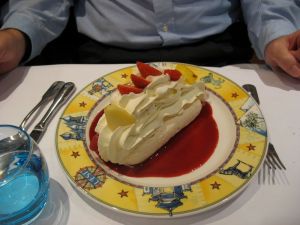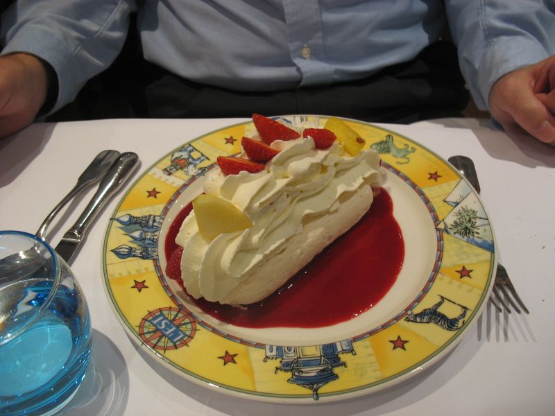 And a perfect closer: their merigne dessert with three types of sorbet, chantilly and fruit on top, with a berry coulis puddle around the outside.