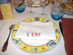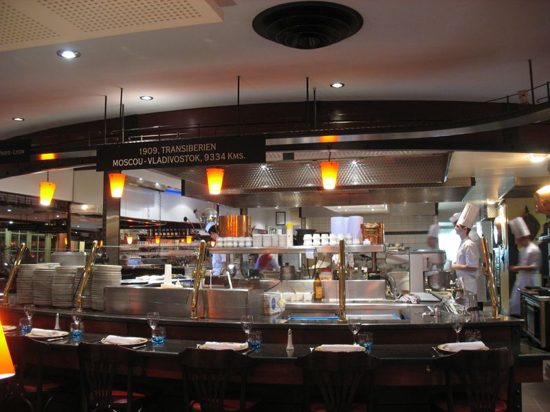 We’re at L’Est–the East–and it is called the food for “Les Voyages.” Around the ceiling’s perimeter runs a small electric train on a suspended track.