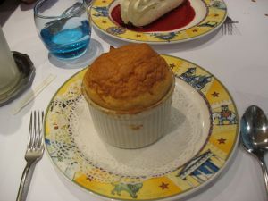 We shared our desserts. First up was the Grand Marinier souffle; I had to quickly take the photo as it was beginning to deflate. Sugar on top–delicious.
