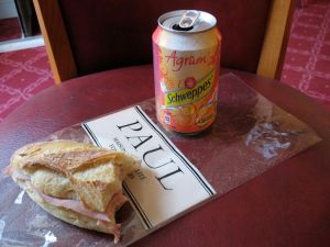 I exit “Ampere”, grab a Le Parisienne sandwich–buerre and jamon (butter and ham)–from Paul and the refreshing soda (recommended by Christine, who had it recommended to her by Jeremy) and head to the hotel.