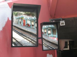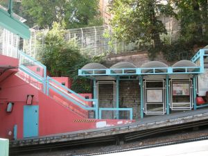 I’ve finished off my breakfast roll, it’s now almost 2 p.m. and I’m tired. So I find the metro–this one’s a tramway on a hill and I like the colors and the angles.