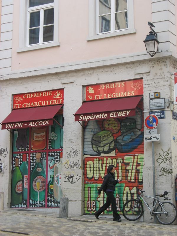 Not trompe l’oeil, but interesting, nonetheless. Each city has its themes, the things it replicates in some fashion or another, throughout its blocks and buildings. Painting is one thing that Lyon “does.” Good food is another.