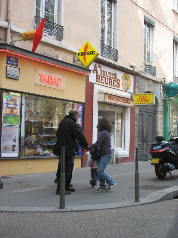 One of these is Tousoie, which Dave tells me means “all silk.” It’s a shop full of all kinds of tubular bolts of silks, some retailing for upwards of $100, all of which are gorgeous, some of which are hand-painted and embellished. I head for the scarves, little luminous drapings of silk by which to remember Lyon’s once ubiquitous silk industry. Tousoie is a “factory store,” a place where one of the last silk factories has a place to sell its wares. The shop owner also informed me (when I asked) that some of their silks went up to Paris, to the designers. I was fascinated with the two-color scarves; the warp thread in red and the weft thread in turquoise, or aqua.