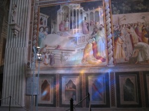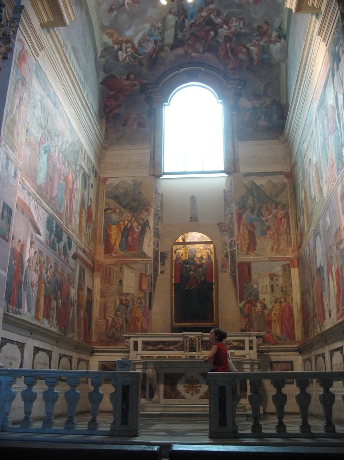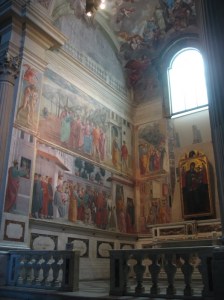 Next up, Brancacci Chapel. I was supposed to have reservations for this. I don’t, I confess to the man behind the window. No problem, he says. There’s a movie I could watch, but I have Rick Steve’s guidebook and feel confident enough with that, so I tell him I’ll watch it afterwards. He points across the cloisters to where they’ll take my money, and after all that, I head up the stairs into a darkened church interior. To my left is the chapel.