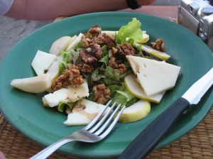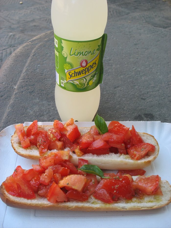 Bruschetta Pomodoro.This was food from the gods, I’m convinced. Paired with a Schweppes lemon soda, I was in heaven. After lunch I hightailed it back in to ask her how it was made, after telling her it was amazing! Chopped tomato, olive oil, salt, oregano, fresh bread–toasted, some basil leaves for garnish. For this to work, each ingredient has to do its part: the tomatoes have to taste like tomatoes, the olive oil has to be of high quality and so on. This is why Americans go dotty for European food–it’s the taste! The grand total of this bill was 2.50 euros for the bruschetta (bruss-ketta) and 2 for the drink. But the taste was divine.