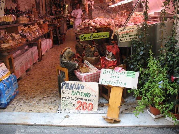 We head to Mercato Centrale, a large warehouse-style building, and on the way see a lovely tableau of wild animals advertising a butcher (below).