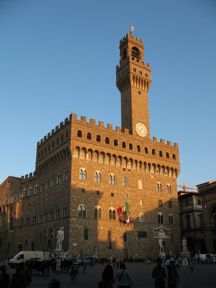 To get there, we cut through Plaza della Signoria, with its Palazzo Veccchio building, all aglow in the evening sun (this is what we were waiting for last night, but we were off by a day for the Florence Glow-Show).