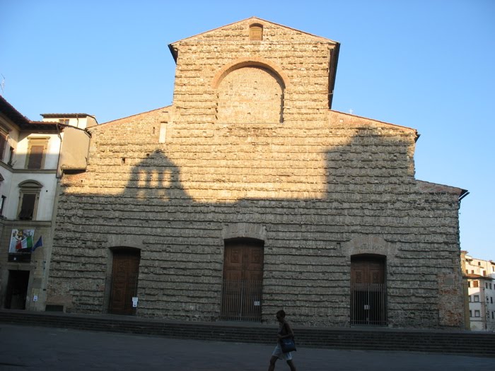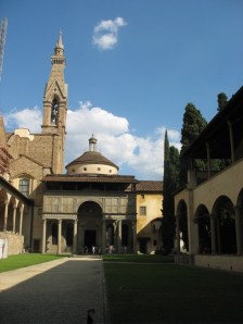 The guide-lady met breathless me at the door. I held up one hand. “Cinque minuto?” I asked. She nodded. I was in. The church’s interior is similar to San Lorenzo, designed by Brunelleschi again, with its classical gray columns against the white plasterwork. I bought a postcard, looked around, and it was time to go.