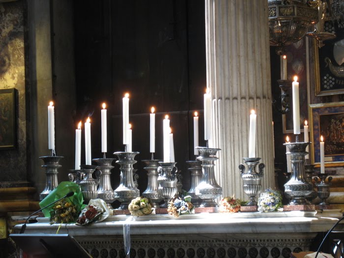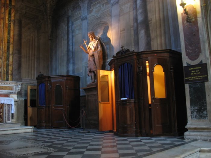So, into Santissima Annunziatta again. The priest is saying mass, so we tiptoe to the back to wait by the confessional booths.