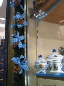 This shop has its Oktoberfest garland all ready: greens with bunches of pretzels tied together with a distinctive blue/white diamond ribbon. The blue/white diamond pattern is like the Bavarian theme, found everywhere. I think it’s also on the Bavarian coat of arms.