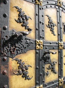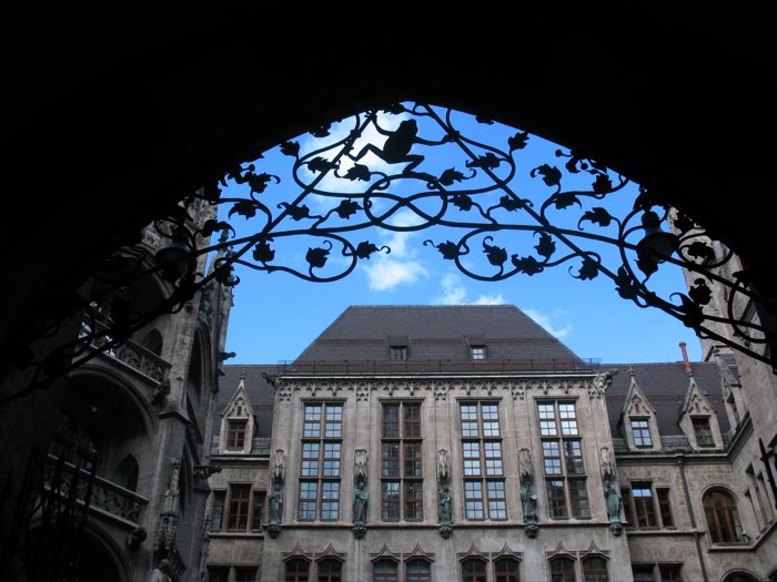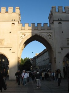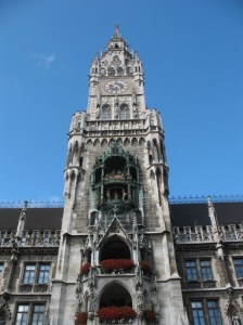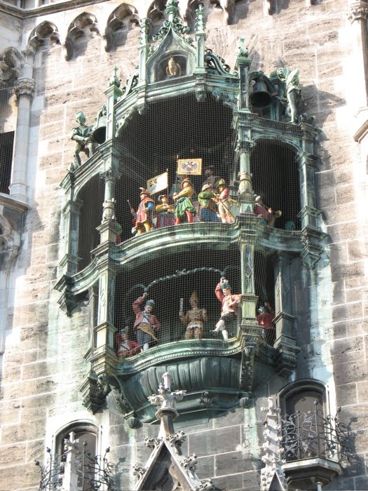 The large door to the New Rathaus (or Townhall), which was built between 1867 and 1908, in a neo-Gothic style, or so the guidebook says. I had gone to Borders before the trip to choose a guidebook for Munich. I chose it on the basis of weight, so some details are missing, but it has a great map in the back. The “Neues Rathaus” also houses the Glockenspiel, the famous chiming clock with moveable figures.