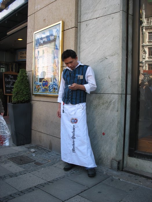 First you notice the buildings in a place, then the people. This waitstaffer was checking his cellphone messages. The long white apron is typical for Germany and we also saw it in Prague, too.