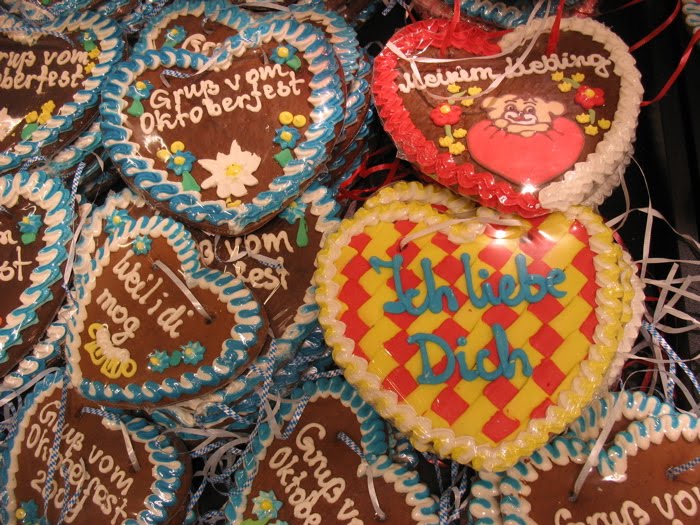 Signs of the impending Oktoberfest are all around us, especially these cookies with ribbons through the top. Make of lebkuchen (gingerbread), they are heavily frosted with designs and lovey-dovey and good luck sayings. We started seeing them everywhere, in the shops and in shop windows with trachten-moden (traditional dress), the cookies looped around their necks.