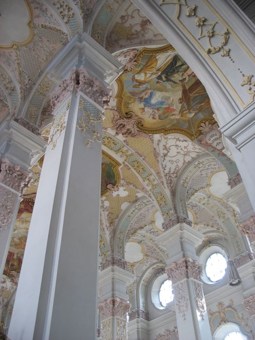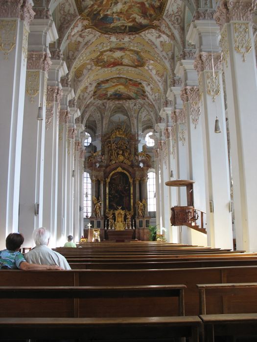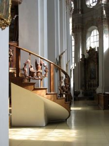 The church began in 1208 as a pilgrim house, but within 50 years it was being used as a hospital. The church itself was constructed in the 1320s and four hundred years later it was re-made into a baroque church, the interiors by the Asam brothers, famous in these parts for their use of lots and lots and lots of rococo flourishes and gilding. Yep. So what entranced me was the plain wooden pulpit on the side, conspicuous in its simplicity.