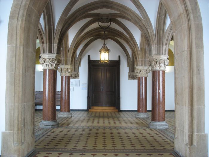 I think it always pays to read up on a place before you go. One tourist had written about the inside of the Rathaus and had a few pictures. When I was leaving the tower, I asked the lady taking money if I could walk through the town hall. Yah, yah, she said, and indicated I should go right when leaving, instead of left to the elevator. I went down the corridor (see Friday’s post for the huge red door), and felt like a bit nervous trying to figure out which door would lead me to where I wanted to go. Down some steps, turn and wow.