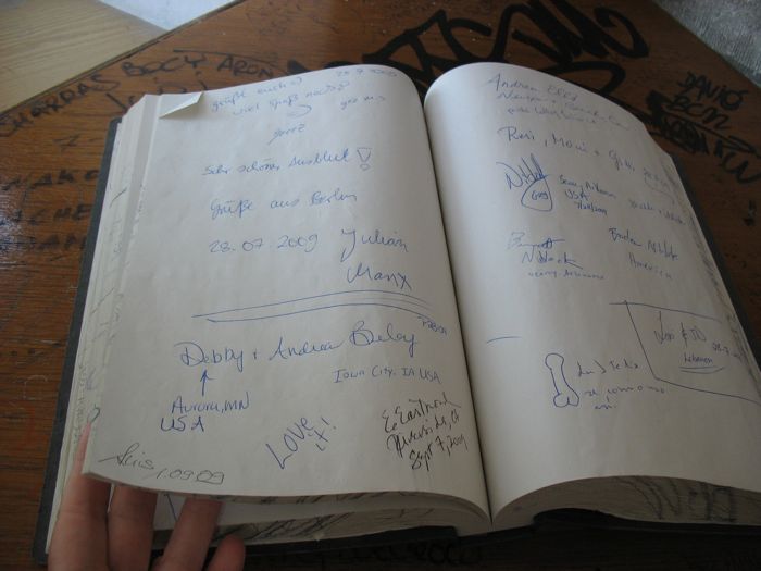 I signed the tethered-by-a-chain book on the way out, in the lower right corner of the verso (or left-facing) page. Notice the dog-eared corner on the upper right. I did that so I could show Dave when we came back. But when we returned later that week, the book had been replaced by a fresh clean copy.