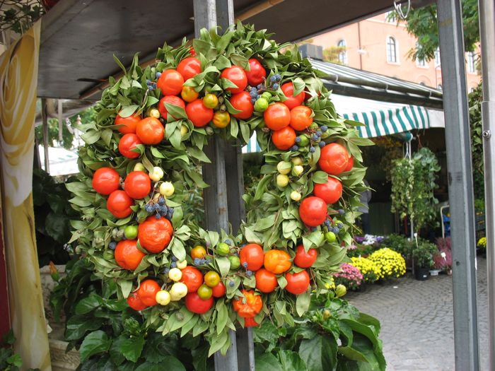On the other side are stalls of fruits, vegetables, and hand-made decorations for the home.