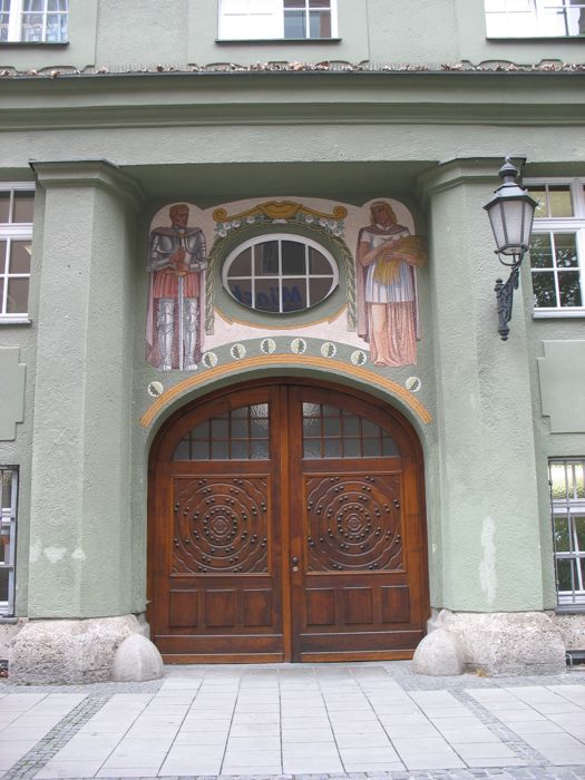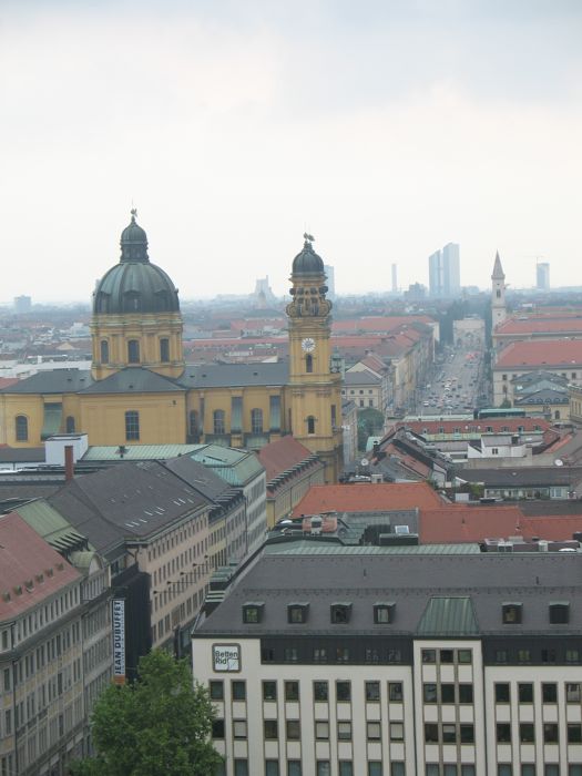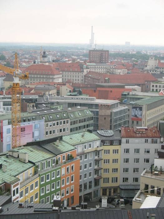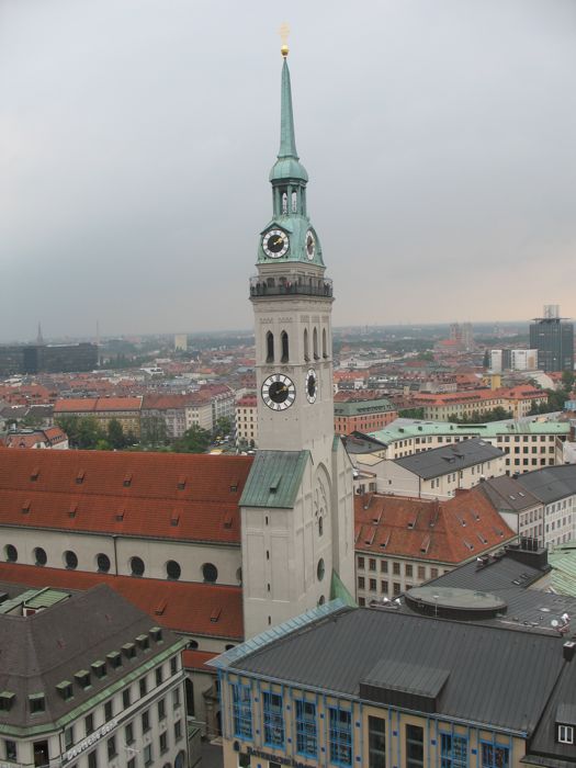 Eat? That sounded good, so we made plans to wend our way down through the Rathaus like I did the other day, but the door was locked. We ate in a little shop on Marienplatz, taking our food up the stairs, through their back door and out into the alley. We sat on the side steps of a church, hoping it won’t rain. We scooted back into the rain shadow of the doorway and then we hoped it wouldn’t rain TOO much.