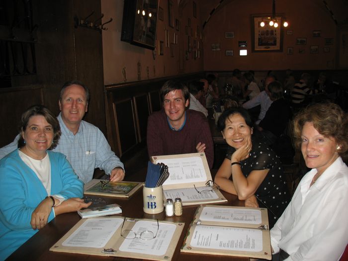 Our last meal at Kafer and the waiter is cranky. We finally place our order (he was NOT helpful) and then a few of Dave’s colleagues join us for a quick meal as the Kafer patio closes at 8, and the shop isn’t kidding. We stroll through Kafer one more time, see some bakery chefs begin work on a car cake. We all decide to go to HofbrauKeller for some warm apple strudel with vanilla sauce (and for our friends, one last beer).