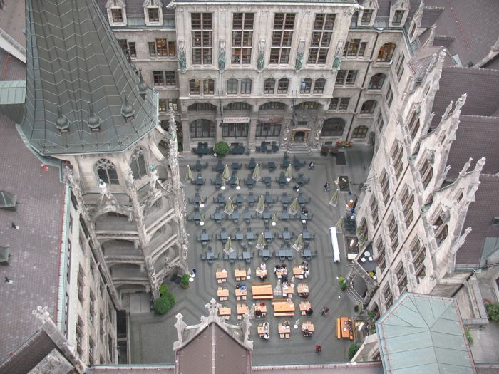 Looking down into Marienhof Plaza, with its clusters of blue umbrellas denoting a place to eat.