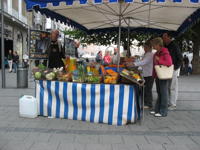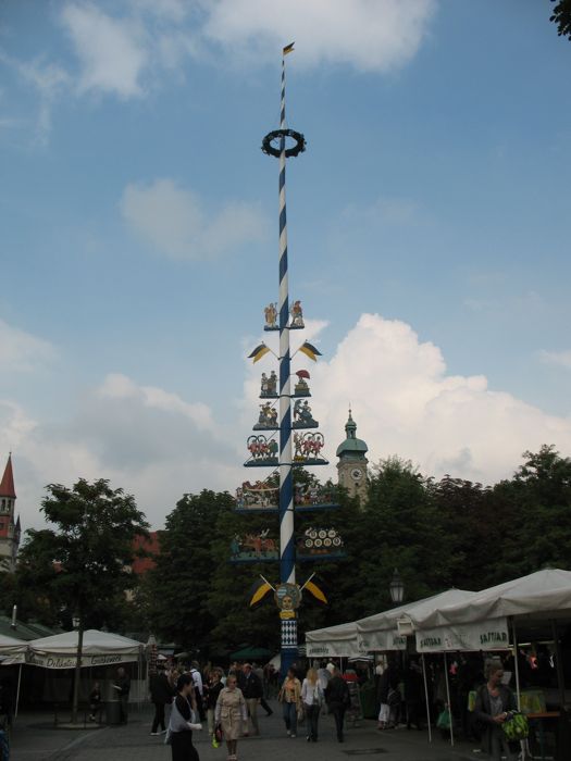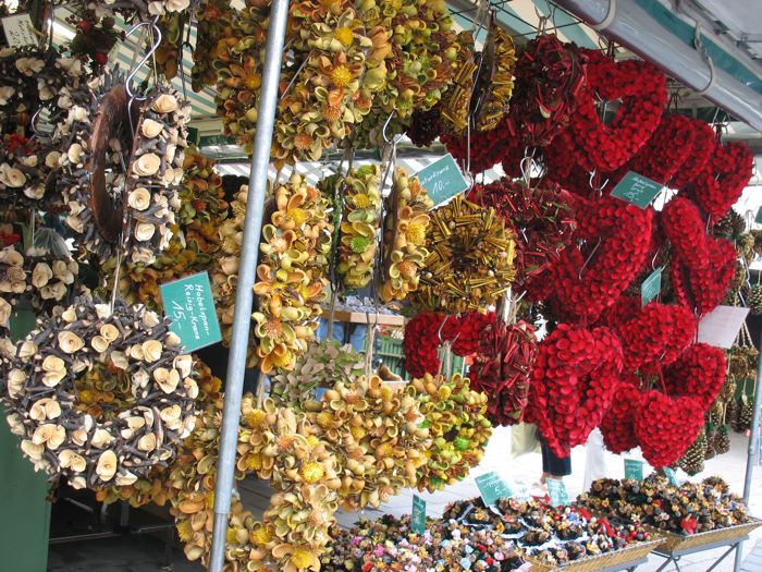 Out the side door and into the Viktualien Market, right next door. It’s basically a large open square, with lots of tables and waitresses dressed up in dirndls, hurrying to deliver beer to thirsty customers.