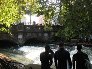 Yep, the surfers. This stream comes out from underneath the bridge at a good clip, hitting some sort of pipe, which creates a moving wave.
