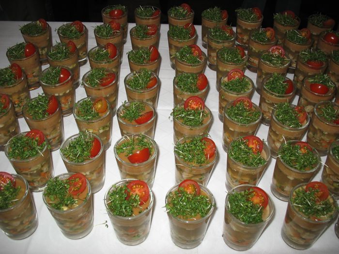 In between the salad and the next course were these little glasses filled with gelatin-ified chunks of meat and sausage. This was the item that most Americans passed over, but that the Japanese tried.