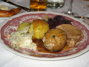 So at this point, we are saying Uncle Uncle Uncle!! but keep eating because this course is the amazing combo of a semmelknodel and a kartoffelknodel and roast potatoes and slow-roasted pork and amazing red cabbage kraut, but if I could have wrapped it up in tin foil to go, I would have.