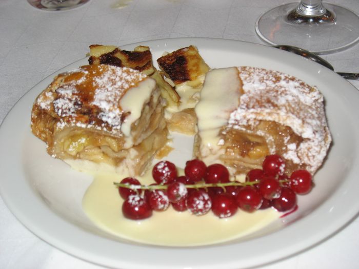 Apple strudel with vanilla sauce and a dessert kind of like a cinnamony saucy cut up bunch of pancakes.