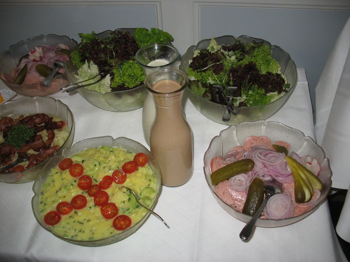 This table was first, with a variety of salads, and pickled vegetables, and a big bowl of fresh green lettuce, and some other very tasty things that you will lead you to think about diets when you go home from Munich.