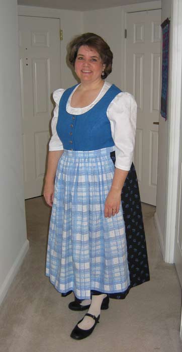 The second one I made after my honeymoon in Austria with Dave. I looked, and I don’t have one of me standing up, so this will have to do. The Austrian women in Salzburg wore theirs with a scarf that they tucked in the sides of the bodice. I now wear the scarf loosely tied.