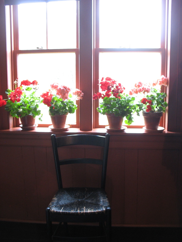 I think I liked this shot not only for the little black woven-seat chair (which reminds me of my dad), but also because the geraniums remind me of my mother, who had a line-up of these plants in her kitchen window, as it was an annual Mother’s Day gift. (We grew up with a farmhouse kitchen in our home, complete with coal-burning stove.)