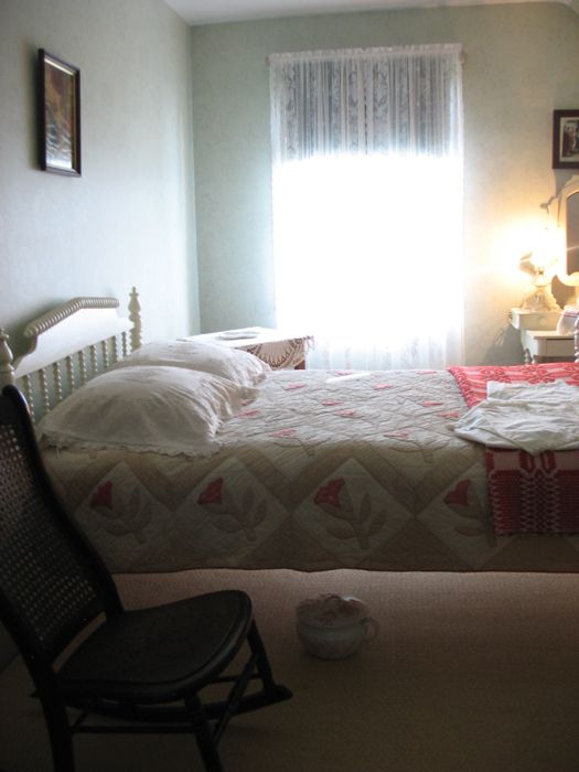 Our bedroom was mostly lovely, but exceedingly stuffed with stuff. Stuff on the nightstands, in the bathroom, on the chairs and dresser, stuff on the beds. Note to innkeepers: leave room for the tourist’s stuff.