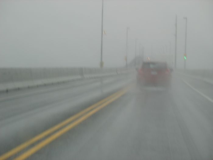 I had wanted to see what the Confederation Bridge–all eight miles of it–looked like as we crossed. This is about all I saw: taillights of the car in front of us and gray falling drippy rain.