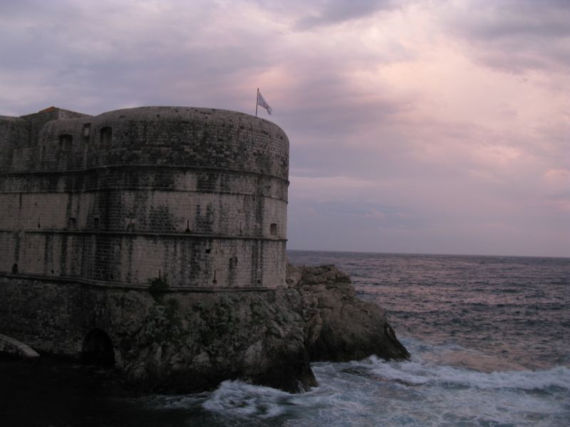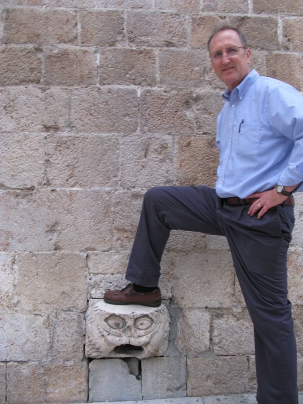 Our plane landed and they wheeled the exit stairs up to our plane. We walked across a street to enter the terminal. Given that we had to give the name of our firstborn child and submit to search, Xray and seizure in major city airports, the casual approach they took toward airline security (probably there, but just invisible to us) was interesting. In the small terminal we found the ATM, bought our tickets and waited on the hot bus for a seemingly long time (probably only 15 minutes) before we drove into Dubrovnik, about 20 minutes away from the airport. I thought the terrain looked like home–Southern California–with its rocky and sparsely vegetated hills; stands of flowers (hollyhocks and others) waved in the airport bus breeze as we rushed by.