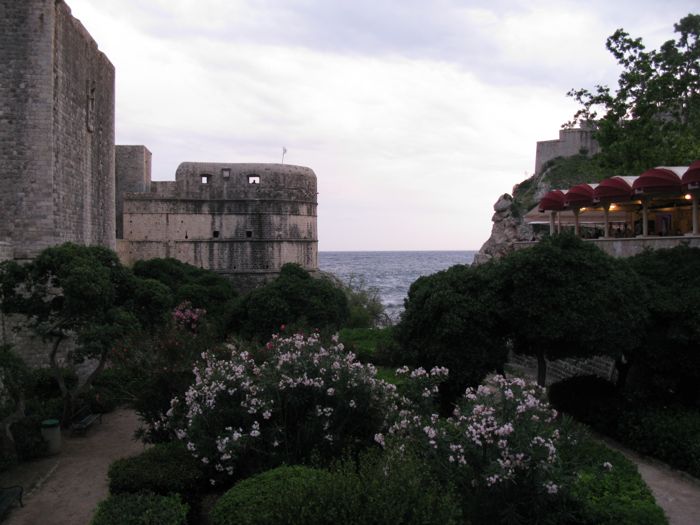 Outside, there are small gardens flanking the walkway through the gate, with views of the Adriatic Sea and Boker Gate on the old City Wall (left). The red umbrellas to the right of the photo are a restaurant, Dubravka, where we ate the next two nights.