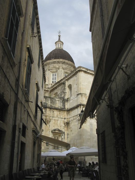 Our sobe, or room, is marked on the map above with a blue circled X, just off Gundulic Square. Stari Grad means Old Town. We ate sort of directly above the black number 7 (above the “R” in Grad), on the restaurant street. We didn’t feel like heading home, trying to stay up as long as possible to get on the new (+9 hours) schedule, so we walked the length of the restaurant street, where we discovered that pretty much every special at every restaurant was about the same as ours, and just as overpriced. The street was narrow, filled with tables, first on the right side of the street and then on the left. It’s one flight of stairs up from the Stradun, so down every side street we had views of the main street. We were also walking, waiting until all the launches had carried the cruise-ship passengers back to their ships and the city emptied out.