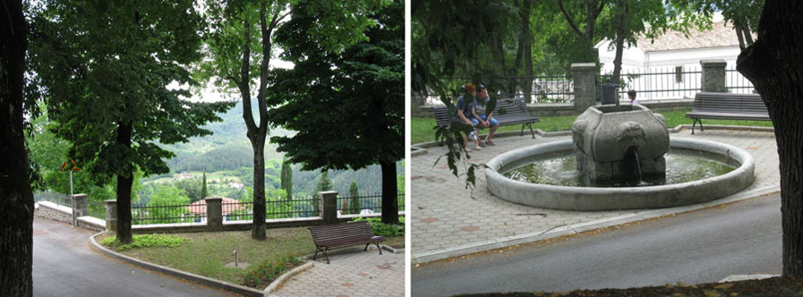 And we opened up the bedroom window, to see the countryside.  We retrieved our luggage from the car, then Dave had to go and repark it “down below,” in a special lot just for the hotel.  We turned left onto a street that looked like it would work, except at the bottom there were stairs.  Nope.  Back up the car.  Around that bend there was another street, but I urged Dave just to park the car in the little parking lot below and we would walk up.  We did so, and found a little pocket park with a fountain, a family and some benches where we could eat our lunch, purchased in Karlovac.