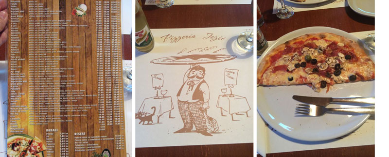 Pizzeria Jezic had about nine hundred options, but luckily a young couple helped us figure out what to get.  We opted for a salad (our standard) and a pizza.  We told the server we would split the pizza, so it arrived, neatly cut in half on two plates. The World Cup was on the television, but since Croatia wouldn’t be playing until the next night, Monday, June 23rd, the town was not as drawn in to what was being televised.  The game was on in the bar as we walked up the hill after dinner, but the dining area in front of the hotel only had two guests.  We remarked on how quiet the town was when we checked out the next morning, and the manager said, “Oh wait for tonight when Croatia plays.”  We were glad to get a good night’s sleep in the beautiful Vela Vrata hotel in beautiful Buzet, Istria.