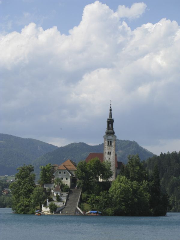 The island from the front. There’s a tale that if you can ring the bell three times, gold coins will fall out of your hair. No, that’s not quite right. If you can ring the bell, all your children will be rich. Hmmm. Maybe if you ring the bell you’ll have True Love? Good Fortune? That you are a gullible tourist? (Pick one.) So it would be quiet on the lake for a while, then a boat of tourists would arrive and we then hear the clanging of the church bell. You have to pay for the pleasure of getting your good fortune, so someone is doing okay, judging from the amount of bell-tolling we heard.