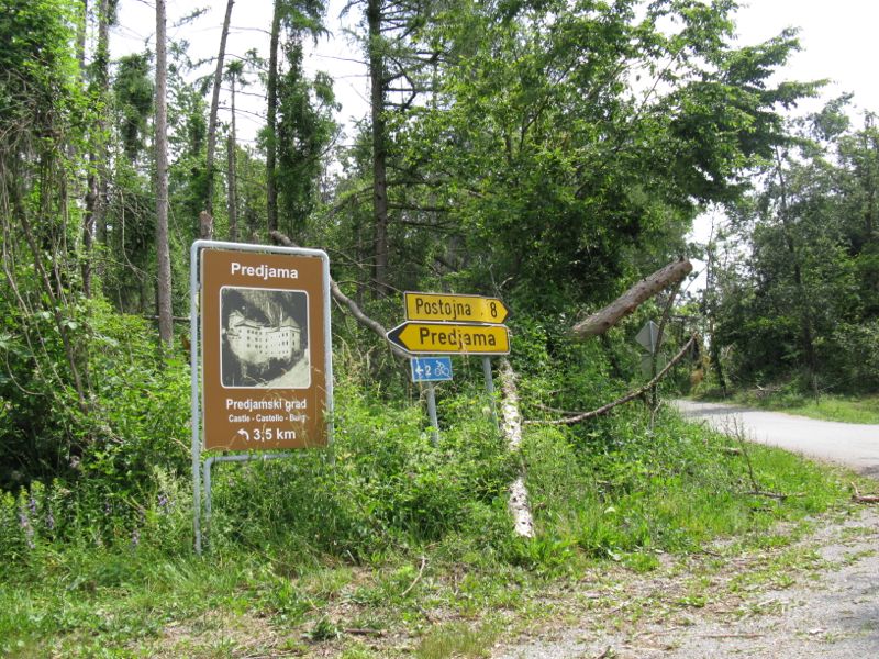 About two exits after we got on the freeway with our spiffy new freeway pass, we left to go “wandering” our way through the countryside, on the way to Predjama Castle, andfound we were driving on the Mast Road, a farm-to-market road through the countryside with some historical significance. We know this because half the sign was in English!