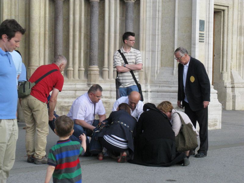 A crowd gathered, including a nun (she came a minute after the photo was taken). One of the women was a doctor, I heard her say. They helped him off to the side, to a bench behind us, so he wouldn’t be trampled as the churchgoers left the service.