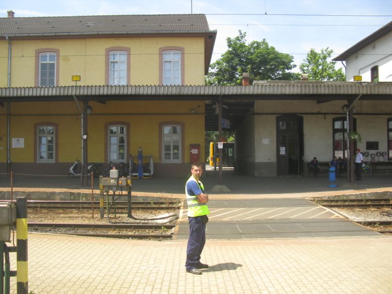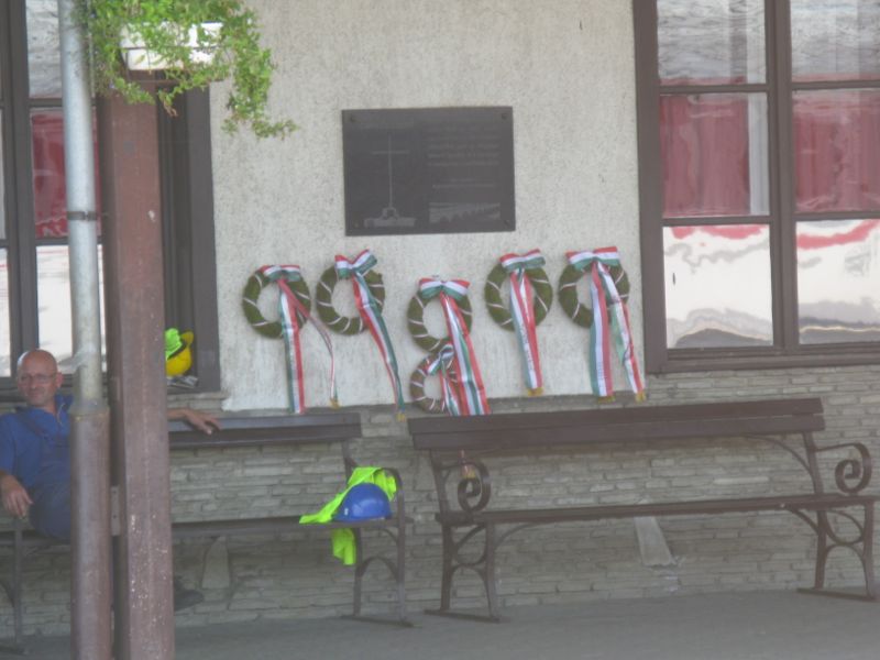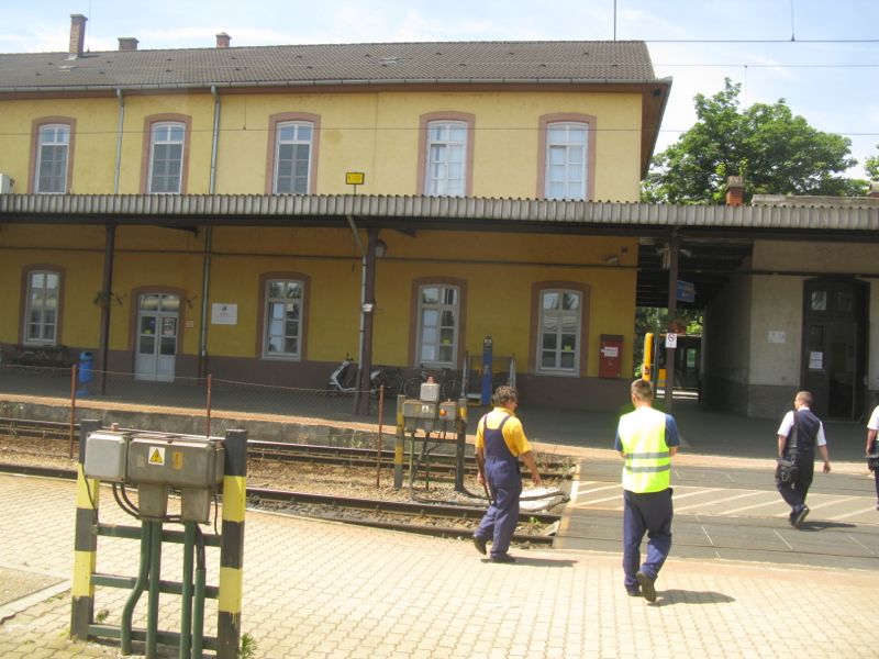 We kept stopping and adding more cars. The train would shudder as they’d connect, then we’d slowly take off again.  This was repeated several times, until at the above stop, we added cars and then chugged backwards.  We had started out with a relatively small train in Zagreb, but when it was time to get off the train in Budapest (nearly an hour late), the train was so long, that those of us in the nice car (which had been at the front at the beginning of the trip) were so far back we had no train walkway to land onto — only train tracks.   Instead we walked through several cars to get to where we could see the train platform of sorts — this was patchy asphalt — but worried about being carried back to Zagreb, so hurriedly got off, dragging our suitcases until we made it to the less-patchy asphalt platform.   We weren’t in Kansas, Toto, and it felt like it.