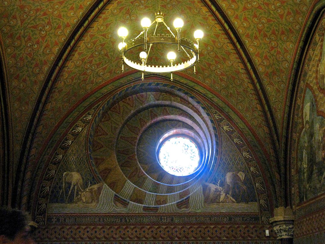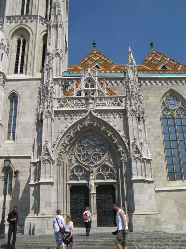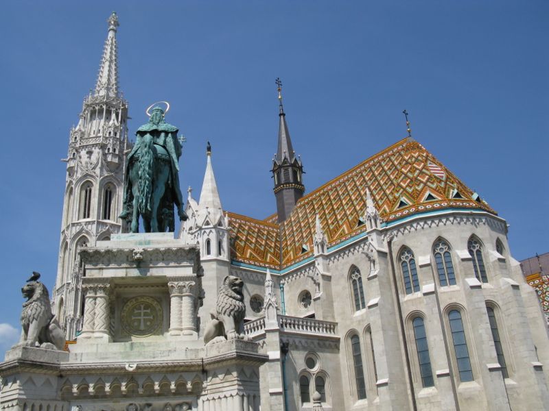 Budapest_6aThis area is known as the Fisherman’s Bastion, as fishermen used to guard this area above the fish market just below during the Middle Ages, however all these current structures date from the 1896 reconstruction efforts.Budapest_6bBudapest_6gBudapest_6hBudapest_6j Budapest_6cThe church still wasn’t open so we explored the small plaza next to St. Matthias’ church, with these bas reliefs at the base of the equestrian statue.  Budapest_6e Budapest_6f The ornately tiled roof reminded me of the one on St. Mark’s Church in Zagreb, but I couldn’t find any information linking the two.  Here’s a closeup from the internet: