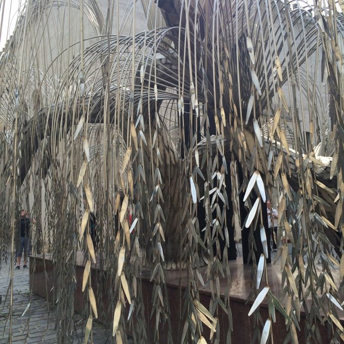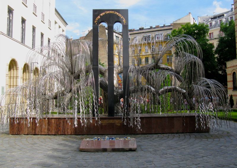 Synagogue nameplate BudapestBudapest_16c Synagogue3Budapest_33Budapest_43Budapest_53Budapest_6 tree of lifeAfter touring the interior, we went outside to the garden behind the synagogue, to see this elegant sculptured Tree of Life by Imre Varga, honoring Holocaust victims.  The “willow makes an upside-down menorah, and each of the 4,000 metal leaves is etched with a name….New leaves are added all the time, donated by families of the victims.”3Budapest_6a tree of life frontThe Hebrew inscription reads, “Is there a bigger pain than mine?”