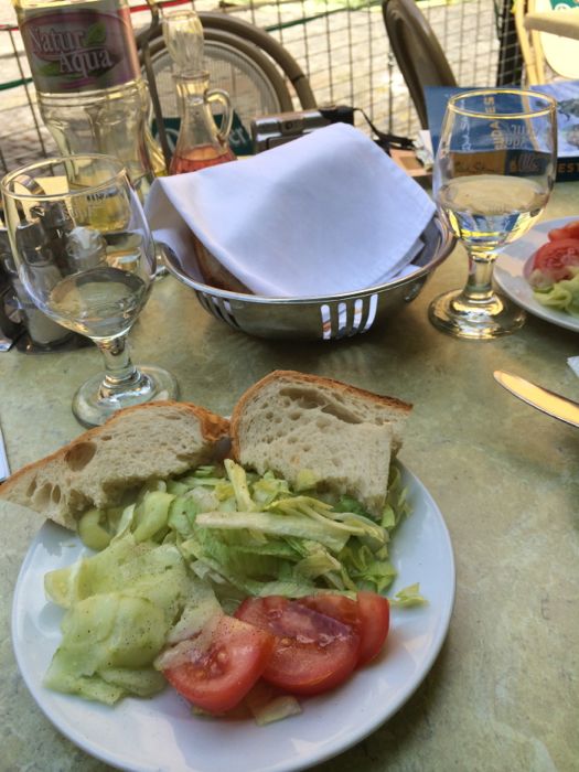 The stuffed squash’s stuffing was pretty good, but the squash needed a few more minutes in the oven.  We were the first ones, typical of English-speaking tourists of a certain age with thick athletic shoes on their feet, so we think we probably surprised the kitchen.