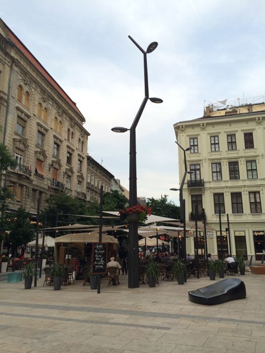 While we do end up eating at the cafe shown above, we first start on the opposite side of the square, for we always have to check every restaurant in the area before deciding where to eat.  But after the friendly English-speaking woman who greeted us sat us down, took off the pristine table cloth to reveal a tattered table, brought us a menu in Hungarian, I bailed and went to the little place above, which promised free Wifi, but we never could get it to work.  Never mind. Budapest Day 1 Dinner1